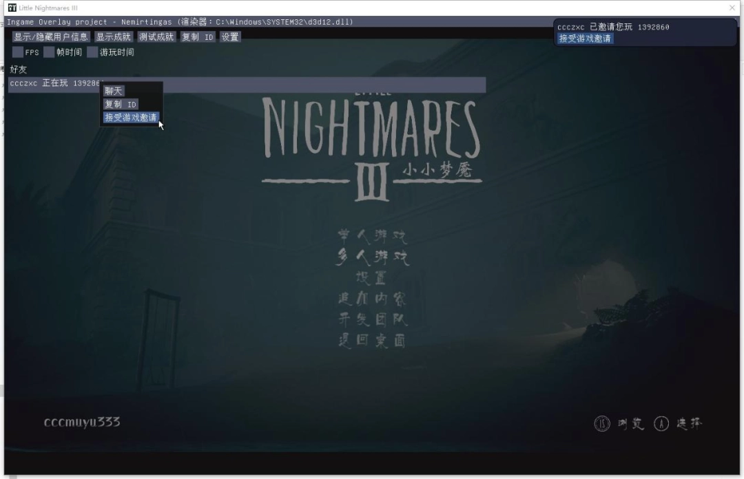 加主机:游戏右上角看到邀请信息——同时按Tab+Shift键呼出联机窗口——找到好友,右键——接受游戏邀请——等主机选择章节——按Enter准备