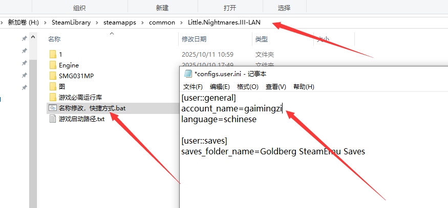 改名字:双击游戏目录下面的名称修改,快捷方式.bat,找到“account_name=gaimingzi”,把“gaimingzi”改成自己想要的名字,保存。