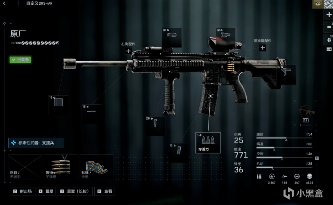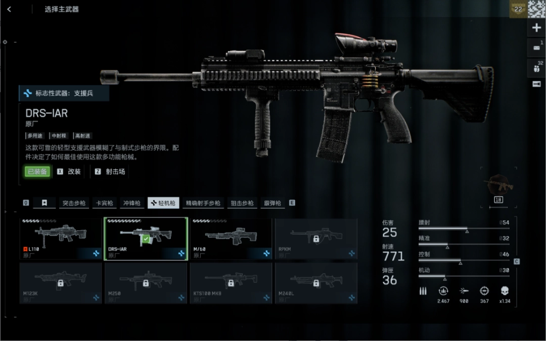 《战地6》中的DRS-IAR轻机枪是游戏里非常好用的强力武器,只要找到好位置就可以趴下开始输出了,常规情况下只需要四五发就可以解决一个敌人,这把枪再加上支援的弹药箱直接开启轮椅模式。