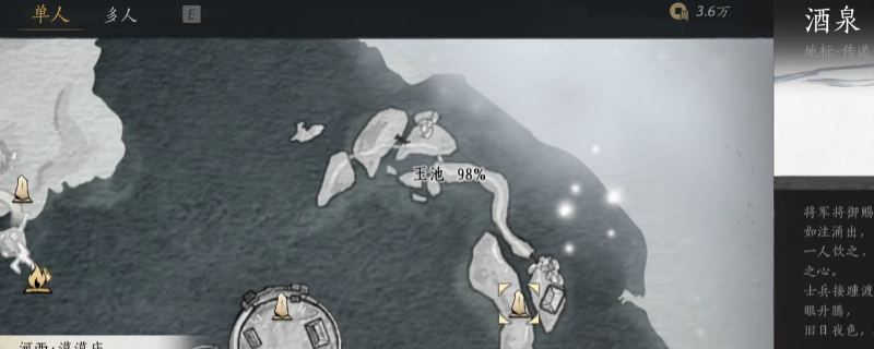 《燕云十六声》中的玉池是游戏里河西凉州地图下属比较大的一个特殊区域,而这个区域存在的见闻数量是比较少的,分别是倾倒入池、戈壁献诗和散金修垒,首先是倾倒入池我们先去酒泉传送点。