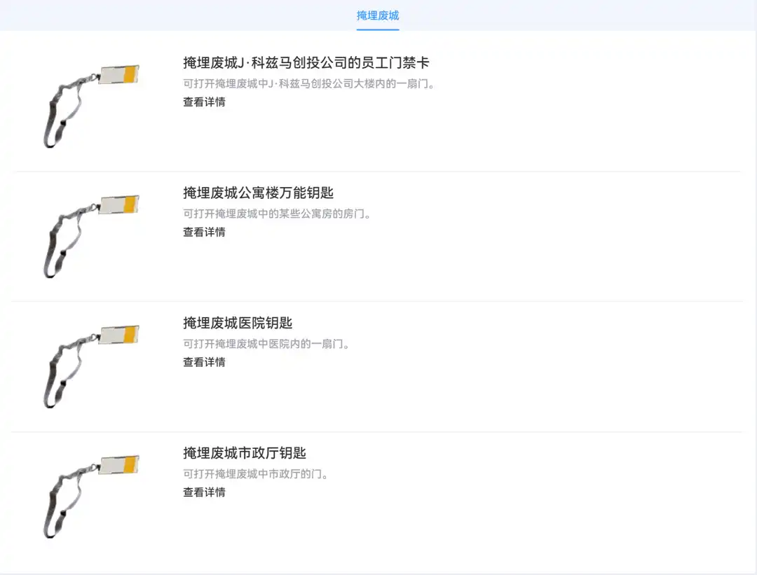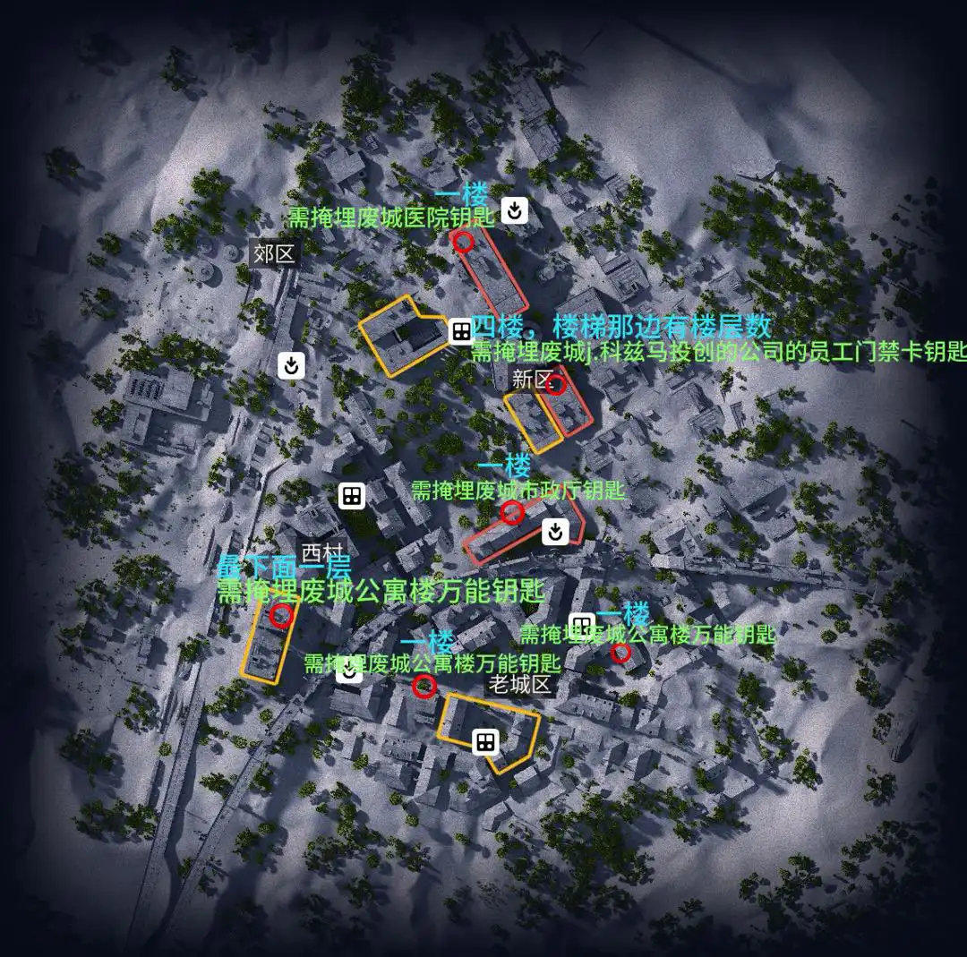 《ARC Raiders》里面有很多不同的钥匙,其中掩埋废城里面就有四把,它们分别是科兹马创投公司的员工门禁卡,掩埋废城公寓楼万能钥匙,掩埋废城医院钥匙,掩埋废城市政厅钥匙,每个钥匙要开启的房间也不同。
