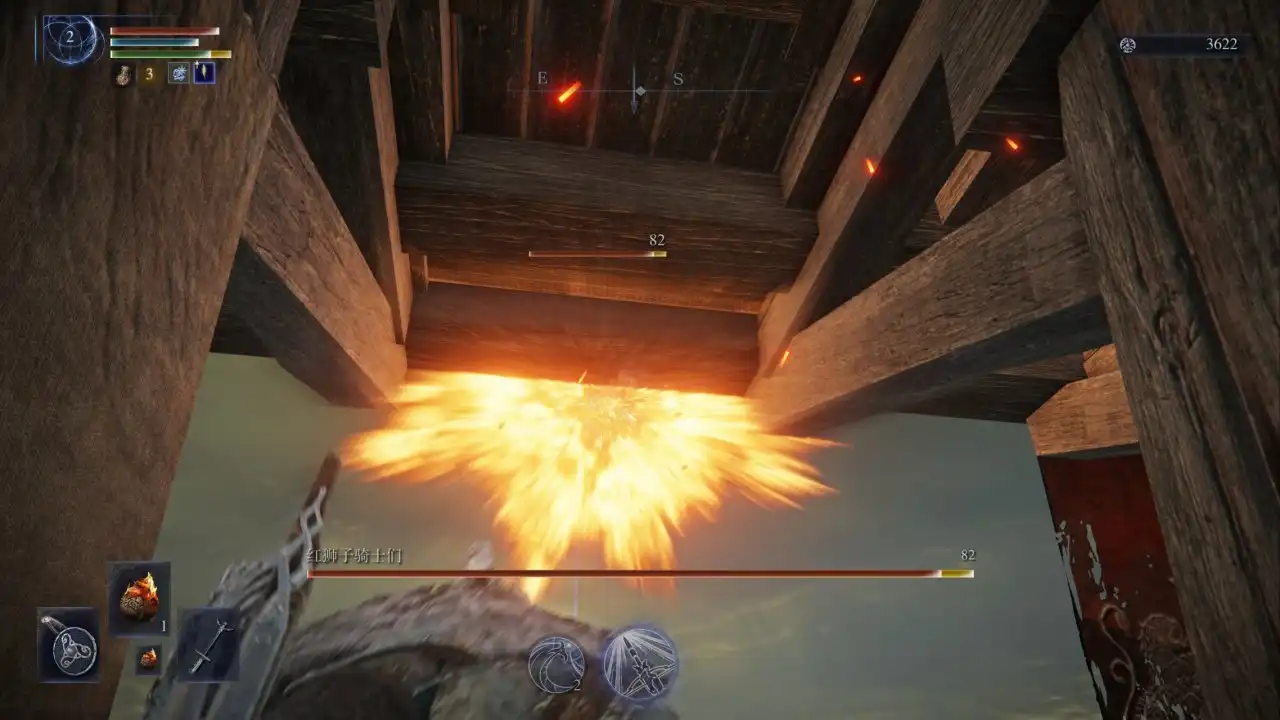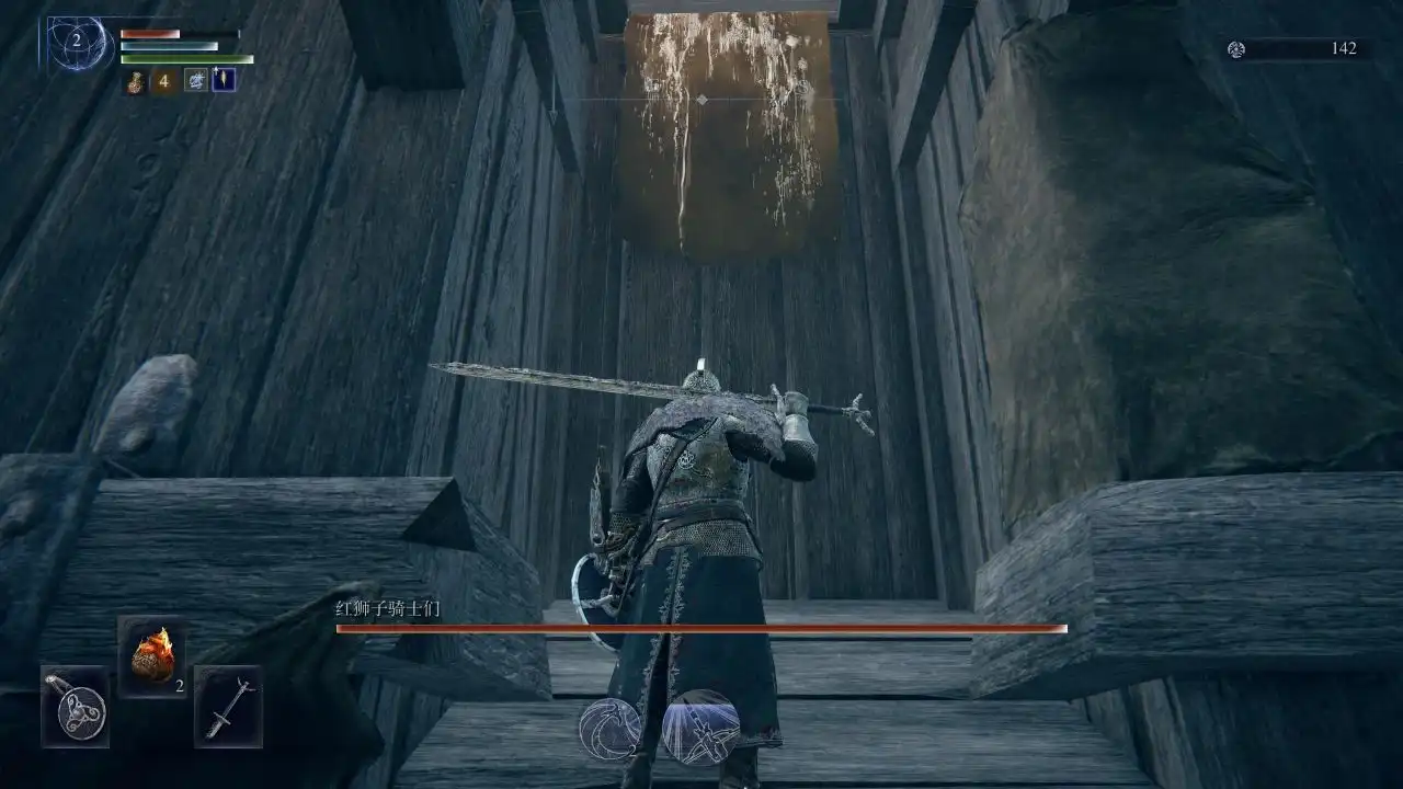 《艾尔登法环:黑夜君临》游戏里面需要玩家清理箭雨骑士,尤其是入侵出现在此处,总是不小心被箭雨射死,所以玩家必须对他重拳出击,玩家对准头顶红狮子位置处扔出事先准备的火焰壶,火焰壶的冲击力即可将他击飞摔死