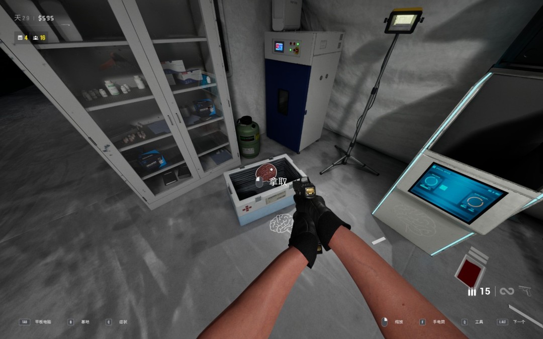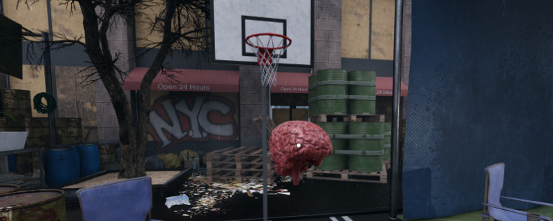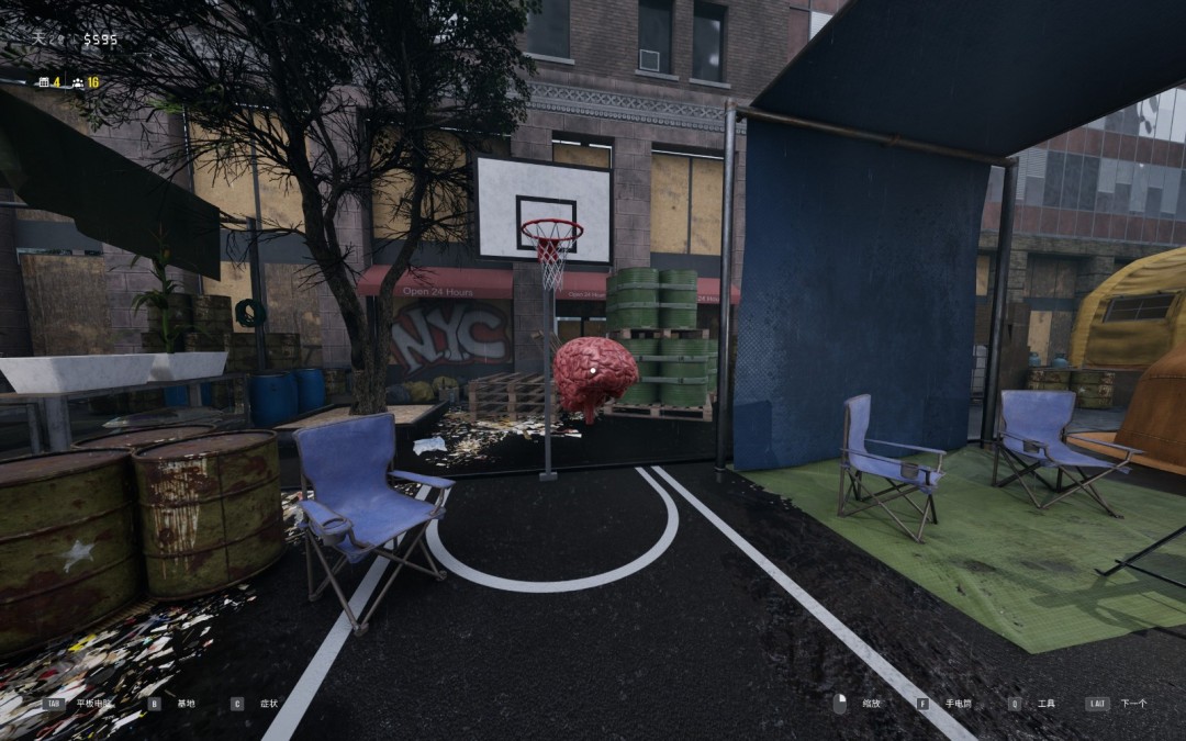 把大脑取下来以后,我们到身后的医疗箱处领取大脑,全程鼠标左键按住不要送,否则脑子就掉路上了,然后一路直奔幸存者住宿区发电机左侧篮球框进入灌篮环节。