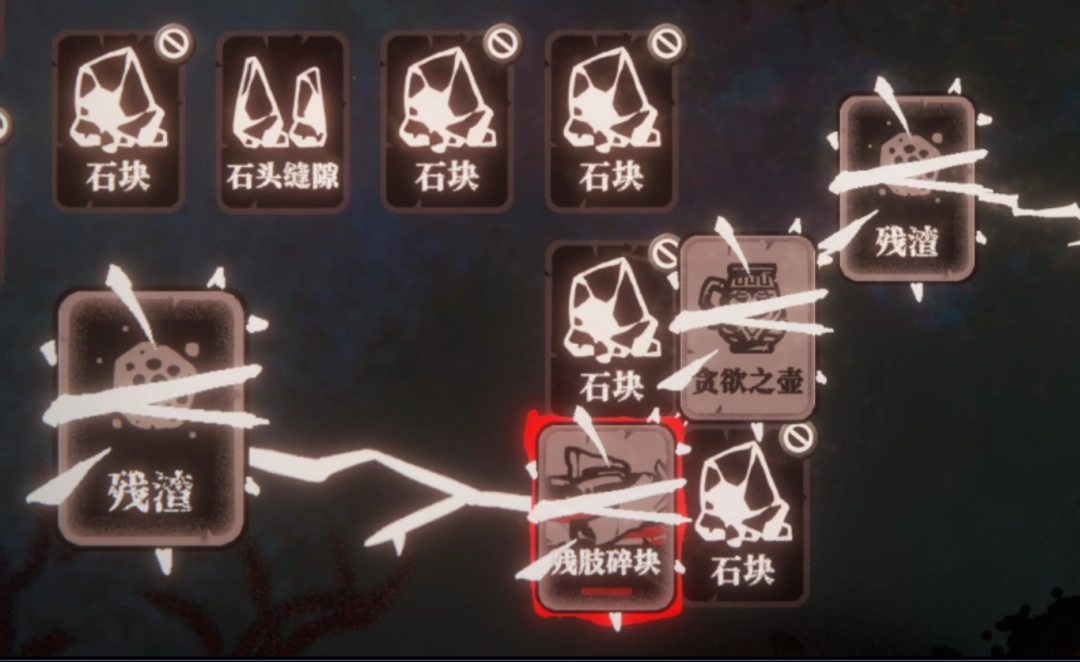《腐根之里》中的卡牌之间链接是需要一些介质的,而想要链接卡牌就需要使用石块,连接卡牌只需要有一条缝就行了,横向和竖向的缝隙很容易注意到,只要在两个石块之间用卡牌搭桥就能顺利连接。