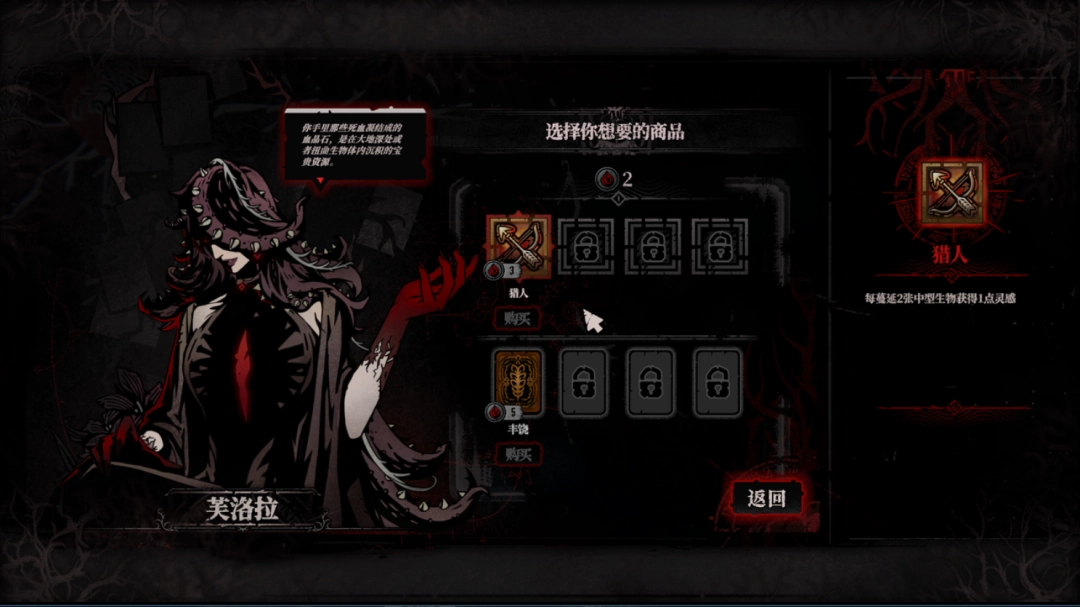 随着剧情推进,在基地的商店里会逐渐解锁一些血纹石和卡牌,购买卡牌虽然能获得一些新的卡牌种类,但也意味着抽到特定卡牌的几率会下降,尤其是在后期,很可能连续开几个卡包都拿不到想要的key牌,如果你的血液运营得不够好会比较难受。