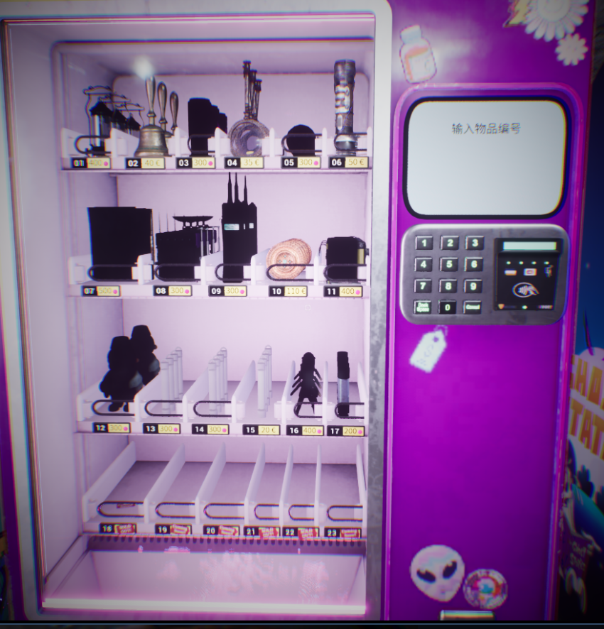 自动售卖机未解锁物品会呈现黑色,需使用诅咒币(红点)解锁后可用游戏币购买