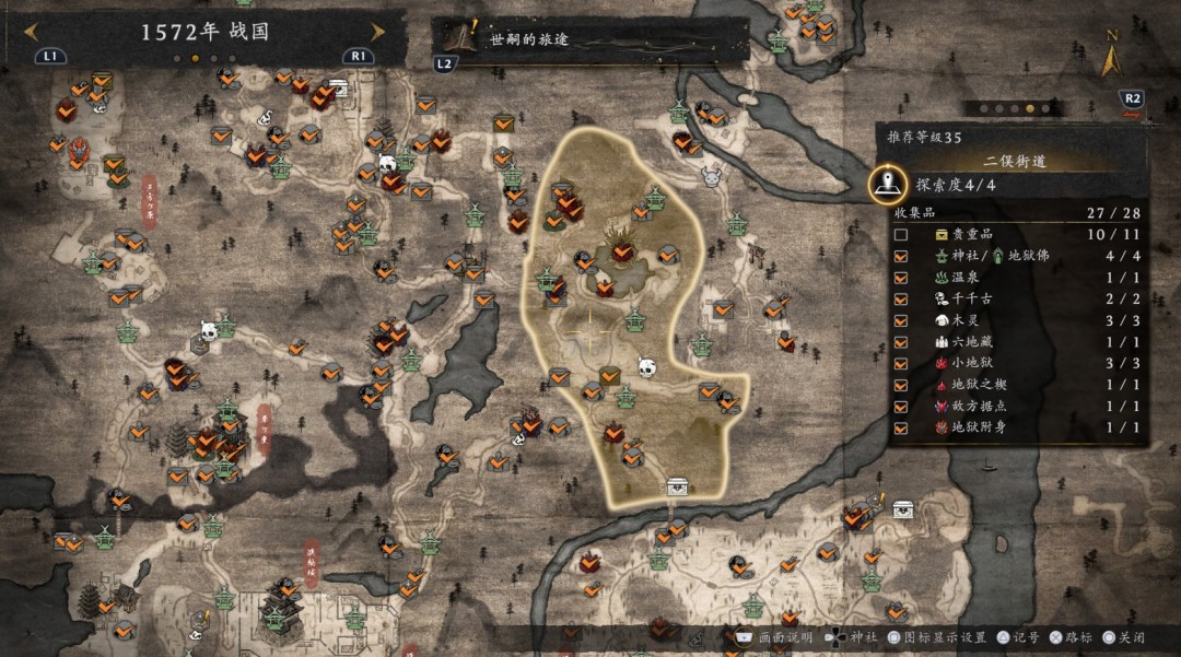 在大地图按手柄十字键左/键盘左键可以看到大地图的神社收集情况(下左图),按手柄R2/键盘R可以看到该区域的收集品情况(下图)