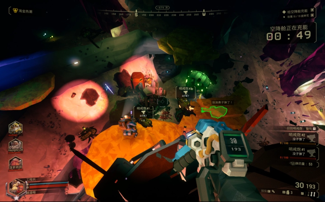 任务开始玩家从空降仓进入矿洞,只要空降仓内有一名玩家就不会飞回去,在高难度下或者刚坠落周围非常危险可以先在空降仓守一波,只要还踩在空降仓的楼梯就不会走。除了空降仓还有定点任务的钻机平台站在火箭顶部虫群一样不会爬上来,但要小心远程敌人。
