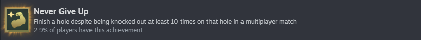 《超级高尔夫大乱斗》里面有很多不同的成就可以解锁,完成之后还会获得奖励,其中就包括永不放弃,如果需要解锁这个成就需要玩家在多人对战中,即使在一洞被击倒至少10次,仍需完成该洞。