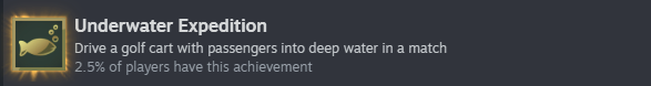 《超级高尔夫大乱斗》里面有很多不同的成就可以解锁,完成之后还会获得奖励,其中就包括水下探险,如果玩家想要解锁这个成就则需要你必须驾驶高尔夫球车驶入足够深的水中,以致使至少一名乘客溺水。