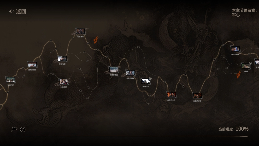 这章是刚开始北伐作战的剧情,所以完全不吃前置条件,把所有选择选完就可以100%收集(并获得捧哏大师成就),但军心会影响第五章。